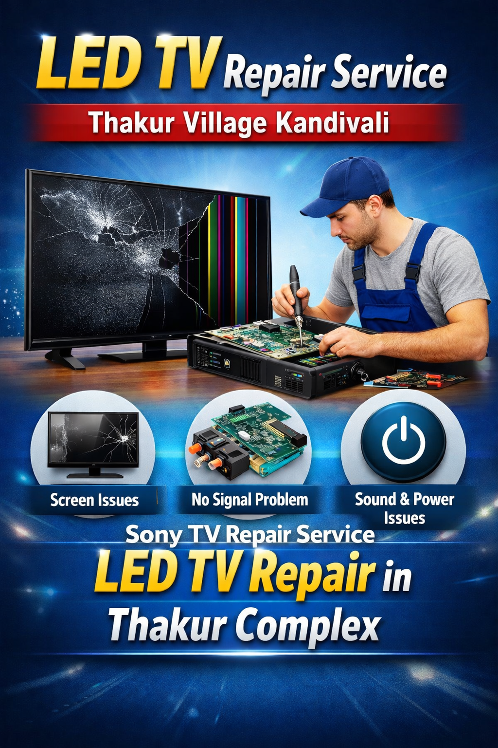 We provide repair services for all types of LED TVs, including Smart TVs and Android TVs. Our team specializes in handling top brands like Sony, Samsung, LG, Mi, Vu, Philips, TCL, Videocon, Sansui, and more We offer LED TV repair services at your doorstep in Kandivali, Borivali, and Malad. Our services include